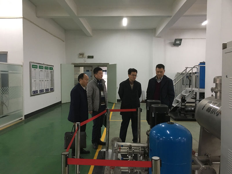 圖為株洲市自來水有限責任公司董事長謝錦輝、總會計師劉國宜親臨設備生產(chǎn)車間視察工作
