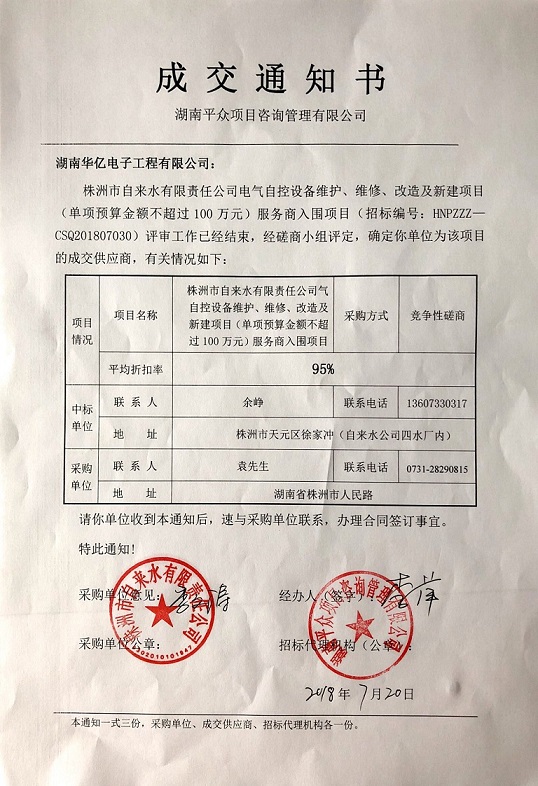 熱烈祝賀公司在“株洲市自來(lái)水有限責(zé)任公司電氣自控設(shè)備維護(hù)、維修、改造及新建項(xiàng)目服務(wù)商入圍項(xiàng)目”中標(biāo)。希望大家在2018年下半年的工作中,勇攀高峰,取得更好的成績(jī)!